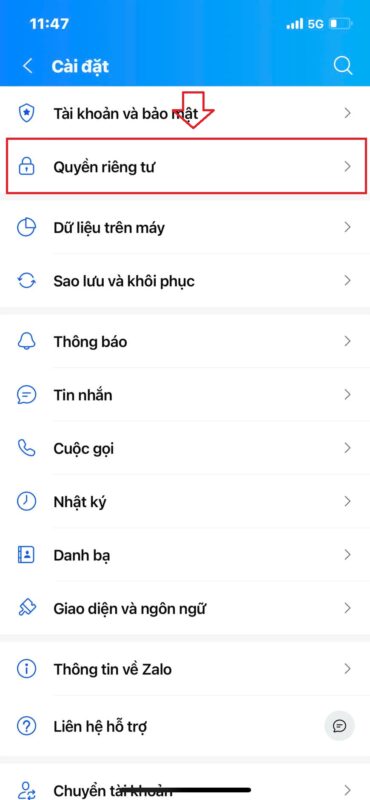 Tiếp theo, bạn vào thiết lập riêng tư Quyền riêng tư.