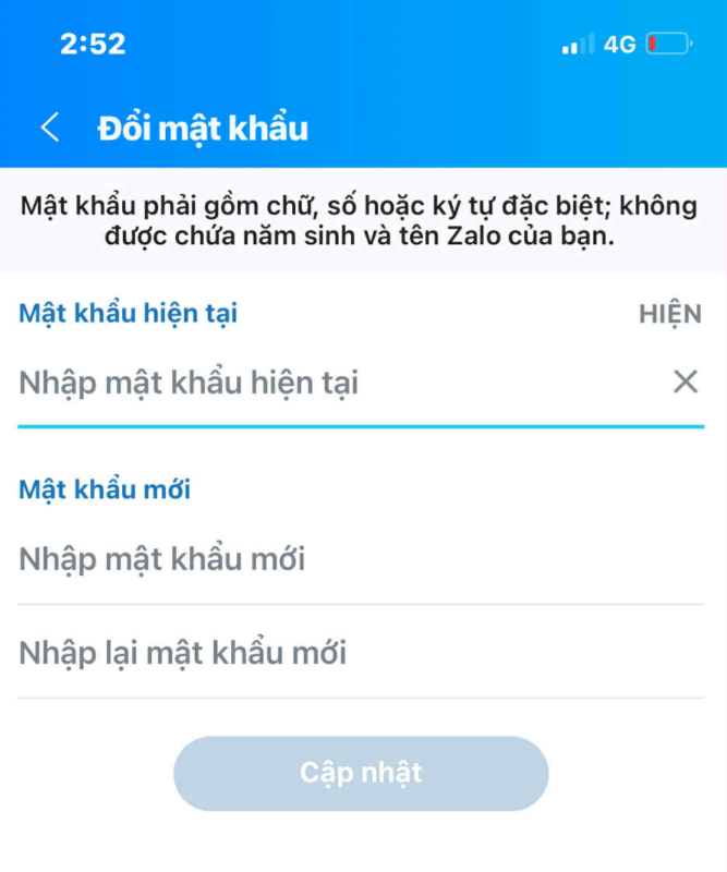 Bước 5: Đổi mật khẩu zalo (Nhập mật khẩu hiện tại, nhập mật khẩu mới và xác nhận mật khẩu mới).