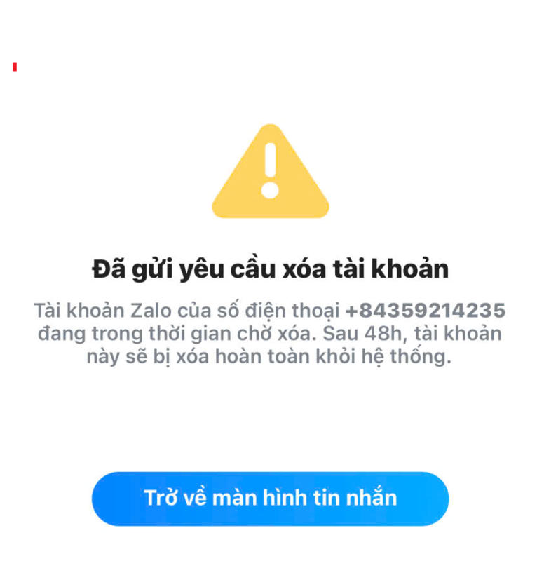 B5: Hệ thống sẽ thông báo cho bạn tài khoản sẽ bị xoá hoàn toàn sau 48 tiếng.