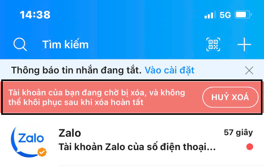 Bạn muốn thay đổi quyết định xoá tài khoản zalo. Bạn chọn HUỶ XOÁ