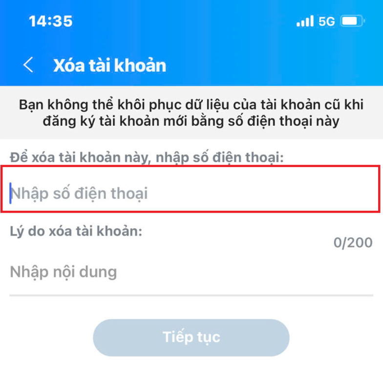 B1: Chọn nhập số điện thoại (Nhập số điện thoại đăng ký zalo bạn cần xoá)