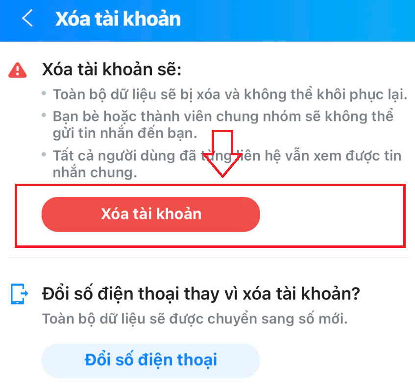 Bước 6: Ở bước này có 2 lựa chọn cho bạn: Xoá tài khoản vĩnh viễn và Đổi số điện thoại